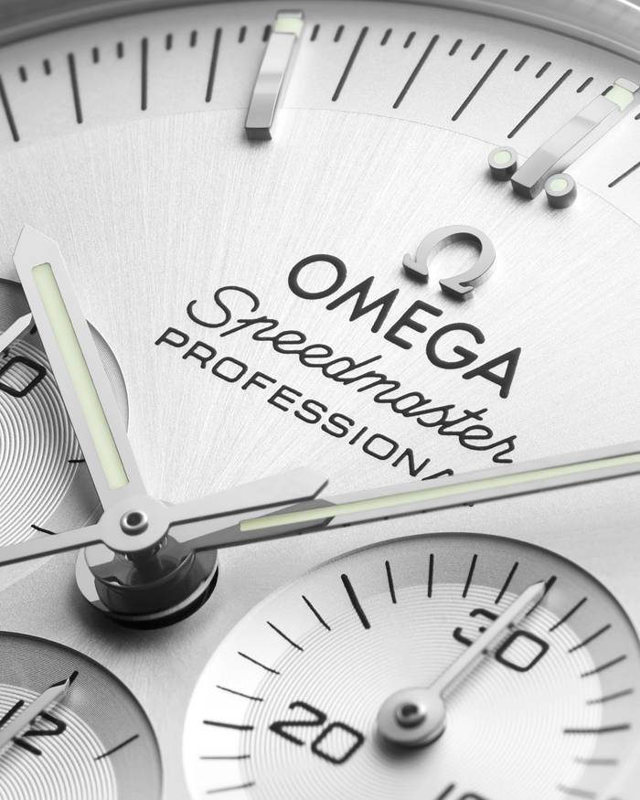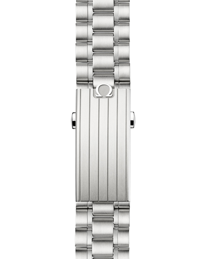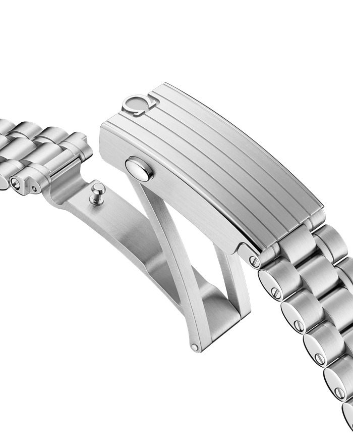 Apresentado com uma bracelete com cinco elos arqueados por fileira, este Moonwatch de 42 mm em Canopus Gold™ de 18K possui vidro de safira na parte da frente e também no fundo da caixa. Inspirado no estilo do Speedmaster de 4.ª geração usado na Lua, também inclui uma caixa assimétrica, um mostrador escalonado prateado com padrão escovado e o famoso ponto sobre o número 90 na luneta em alumínio anodizado.