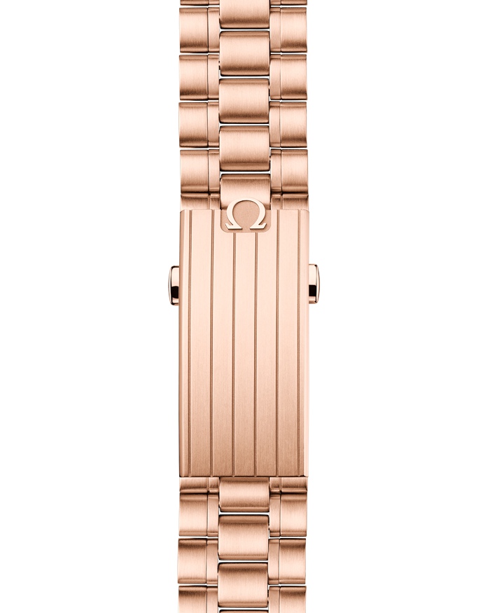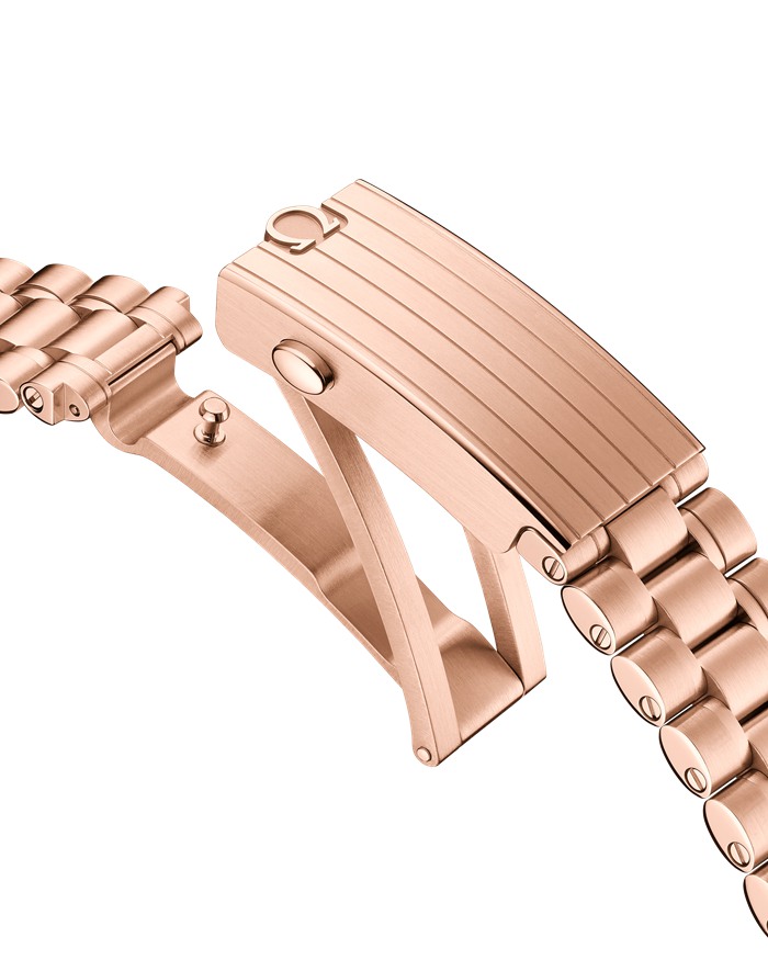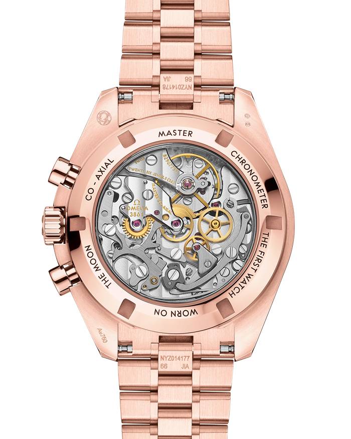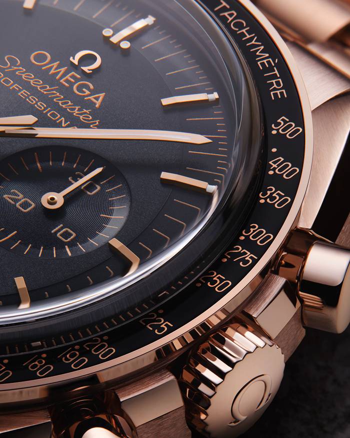 Apresentado com uma bracelete com cinco elos arqueados por fileira, este Moonwatch de 42 mm em ouro Sedna™ de 18K possui vidro de safira na parte da frente e também no fundo da caixa. Inspirado no estilo do Speedmaster de 4.ª geração usado na Lua, também inclui uma caixa assimétrica, um mostrador escalonado preto e o famoso ponto sobre o número 90 na luneta em alumínio anodizado.