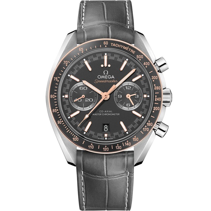 Apresentado com uma bracelete em pele cinzenta, este modelo Speedmaster Racing Master Chronometer apresenta uma caixa de 44,25mm em aço inoxidável com uma luneta em ouro Sedna™ de 18K. O anel da luneta em nitreto de silício inclui a famosa escala taquimétrica em OMEGA Ceragold™.