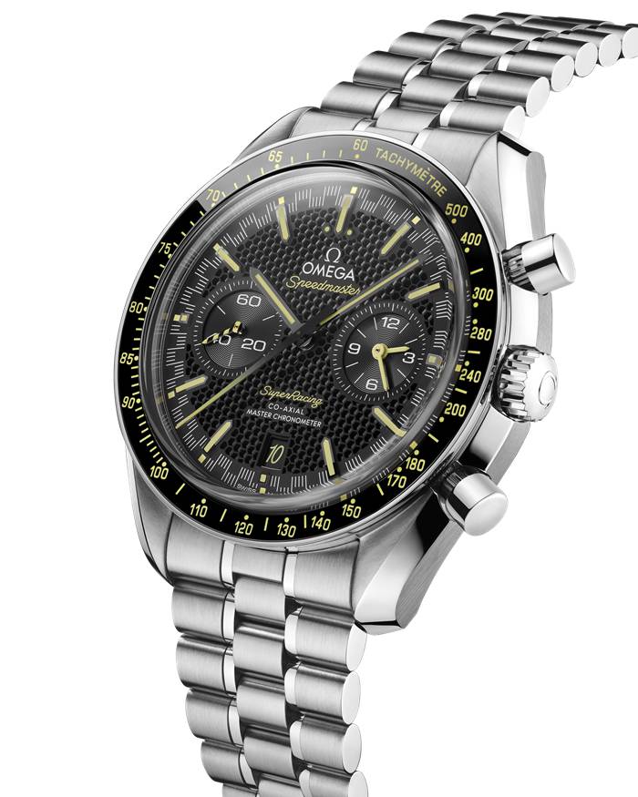 Os índices “ponta de seta” pretos biselados e polidos com diamantes são preenchidos com Super-LumiNova amarelo, que emite uma luz amarela. Este código de cor estende-se às palavras Speedmaster e Super Racing gravadas no mostrador.