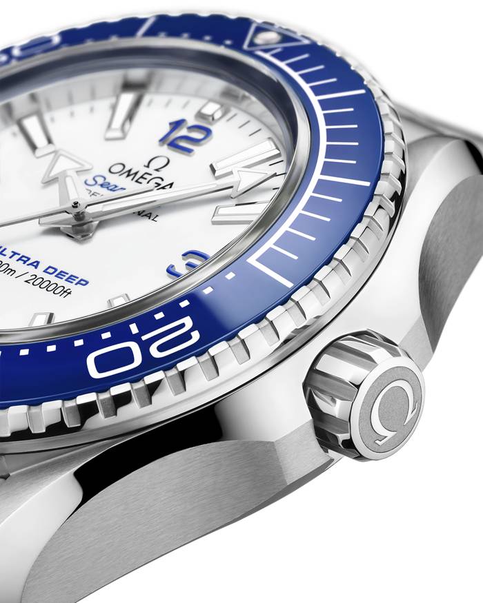 Este modelo de 45,5 mm com o robusto O-MEGASTEEL apresenta uma luneta em cerâmica azul polida com a sua escala de mergulho em esmalte branco. Através do vidro de safira saliente e abaulado, o mostrador branco lacado surge com quatro algarismos árabes em azul, assim como ponteiros e índices em ouro branco de 18K, todos revestidos com Super-LumiNova branca.